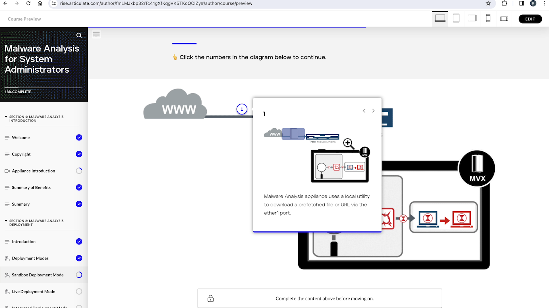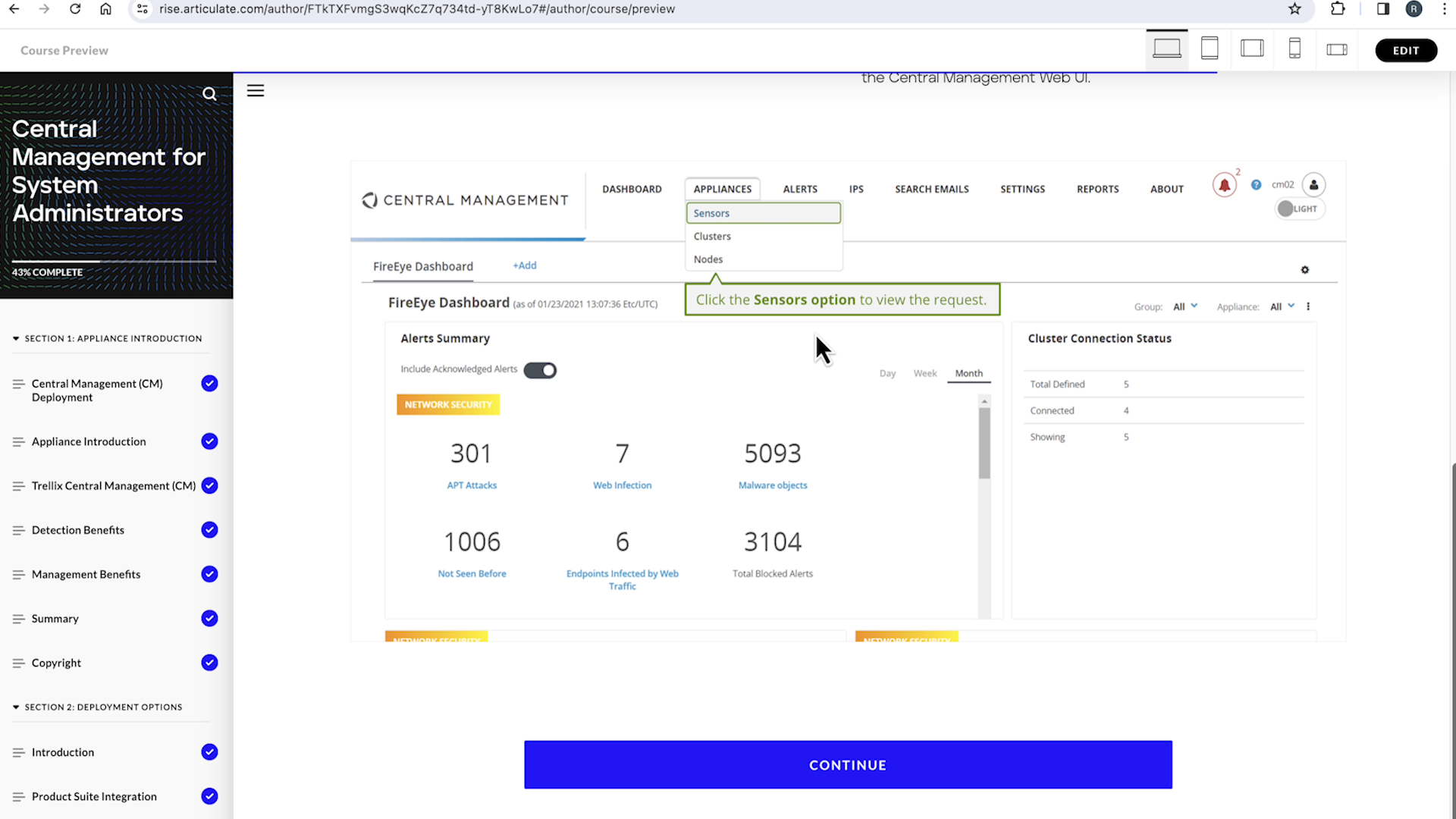 From January of 2022 to January of 2024 working predominately with Articulate Rise 360 and Articulate Storyline I was responsible for the conversion, update and maintenance of the entire FireEye/Trellix e-Learning web library, consisting of 39 courses. It was my responsibility to translate all previous HTML and Javascript interactions into Storyboard and Rise. Some interactions like accordions and hotspot interactions were translated using Rise but the others, the more complex interactions like branching scenarios and dynamic screen tours, were developed using Articulate Storyline.