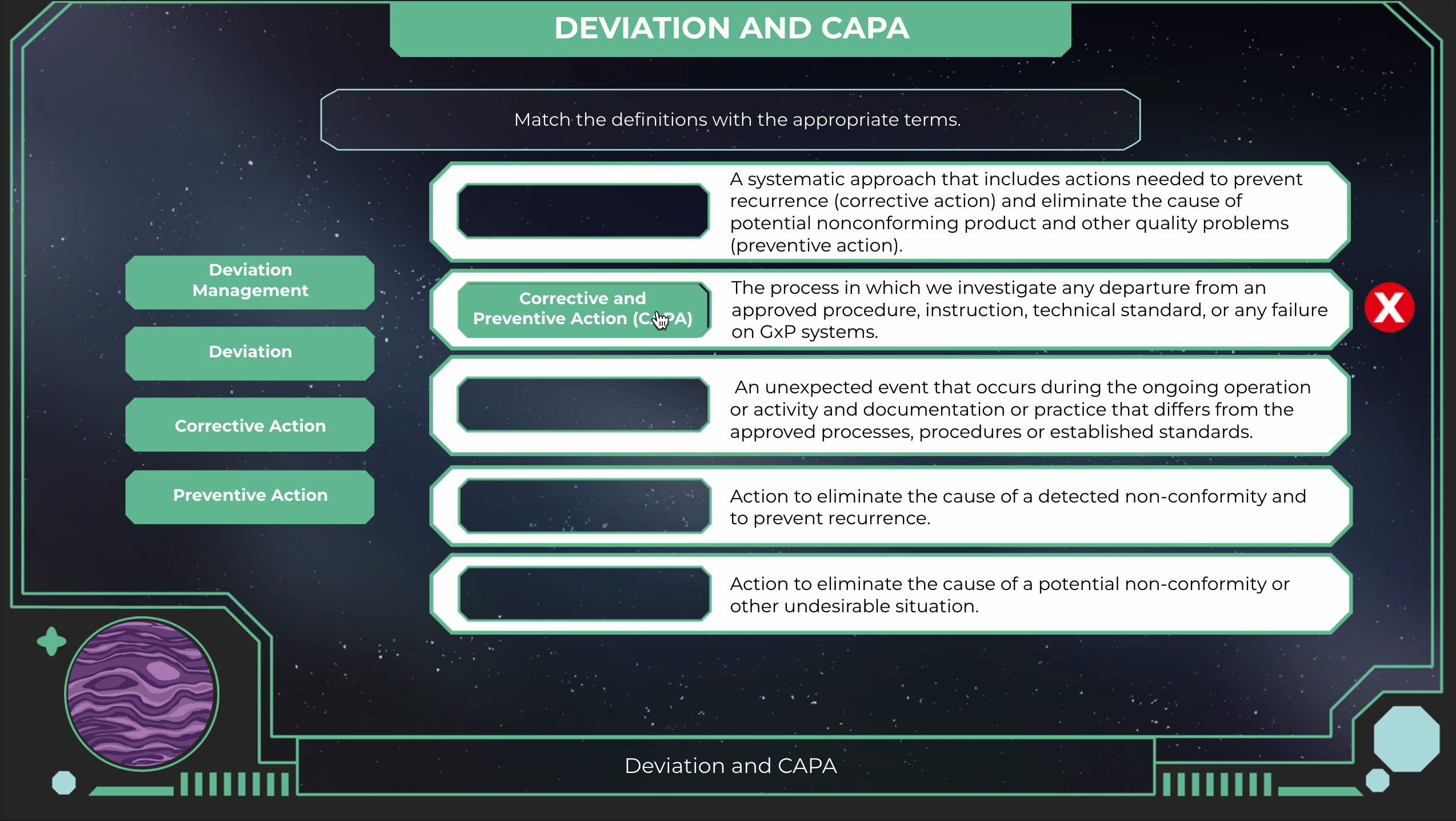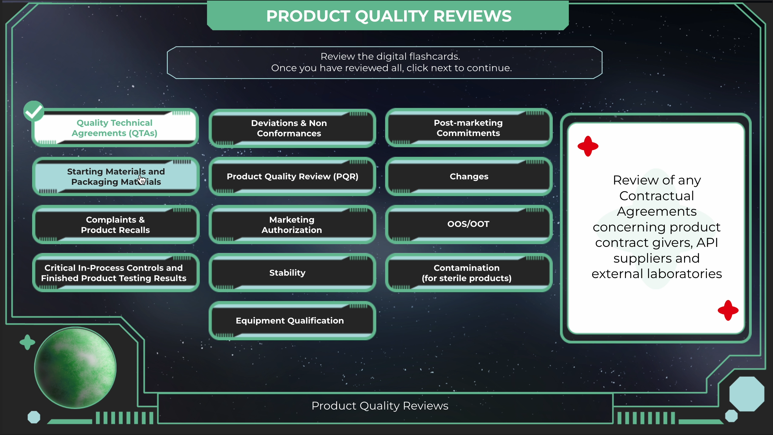 While collaborating with King and I Learn, I partnered with Pharmathen to create eLearning experiences that transformed regulatory and quality topics into something truly imaginative. One standout course took the shape of a space exploration adventure, where learners traveled to 16 custom-designed planets, collected gems, and explored quality management through interactive HUDs, sci-fi visuals, and free-roam learning. Across multiple projects, I focused on designing colorful interfaces, icons, and characters that turned even the most technical subjects into fun, visually rich experiences.
