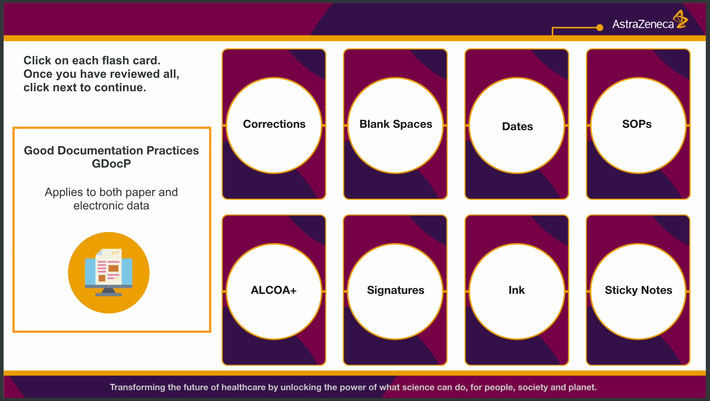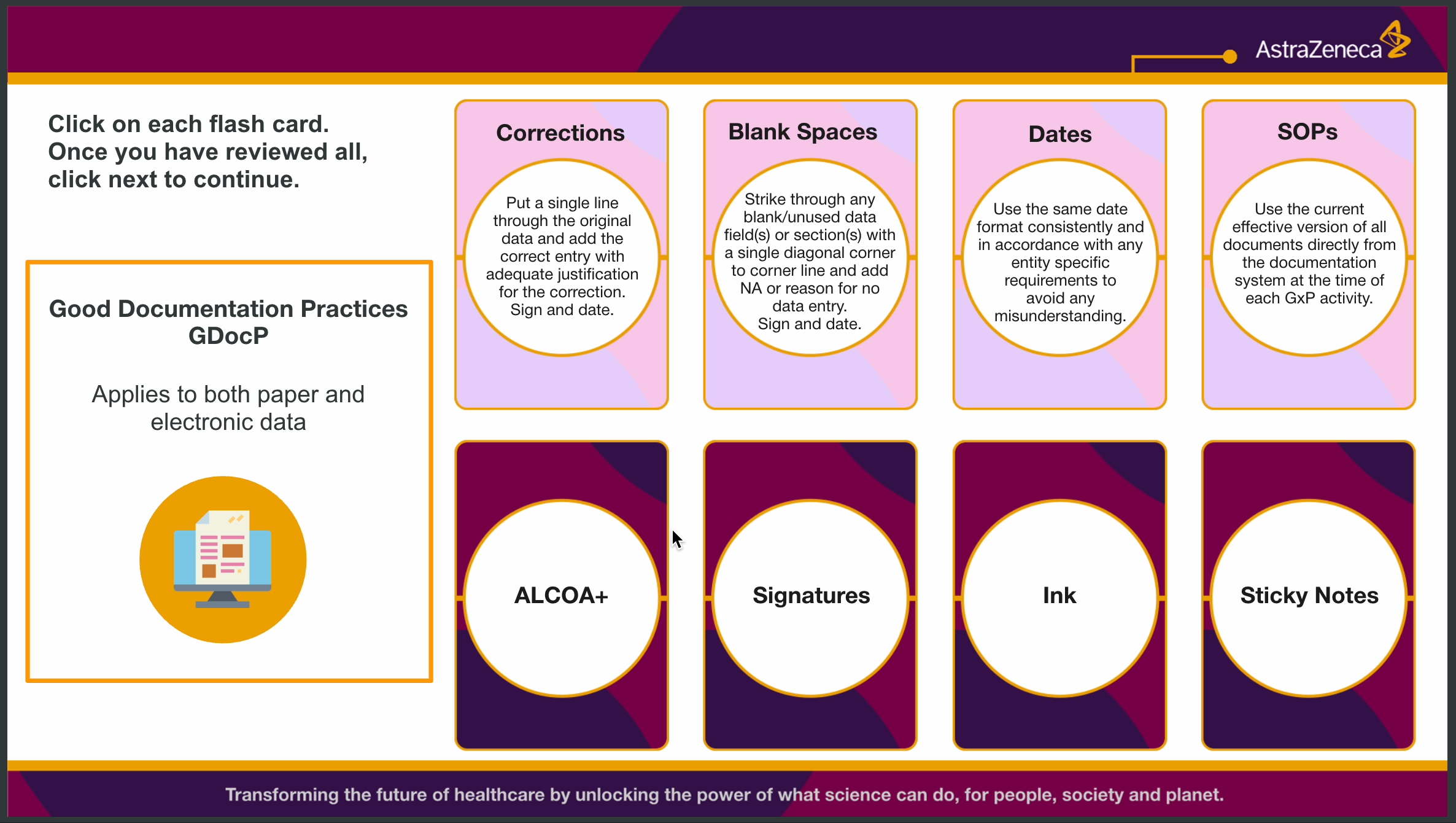 Collaborating with AstraZeneca on a rapid-turnaround Articulate Storyline course, our team at King and I Learn pulled together seamlessly to deliver a beautifully designed and fully functional learning experience on a tight deadline. We combined sleek interface design with pre-built interactive elements like click-reveals and flip cards—ensuring both speed and polish. One standout creative effort was a fully illustrated 10-panel comic narrative developed for a lesson; though ultimately replaced by photography, the original artwork still lives on under the Illustrations tab of this site.